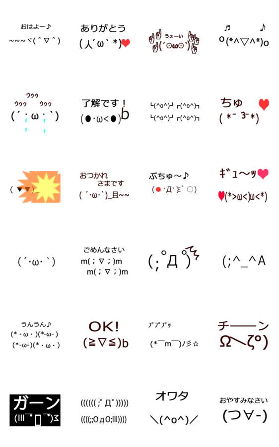 楽しく使えるアニメーション顔文字です♪ 良く使われる顔文字を選びました。毎日使えます。ちょこっと動いたり、激しく動いたり、ちゅっあり。受け取った相手は?嬉しい?