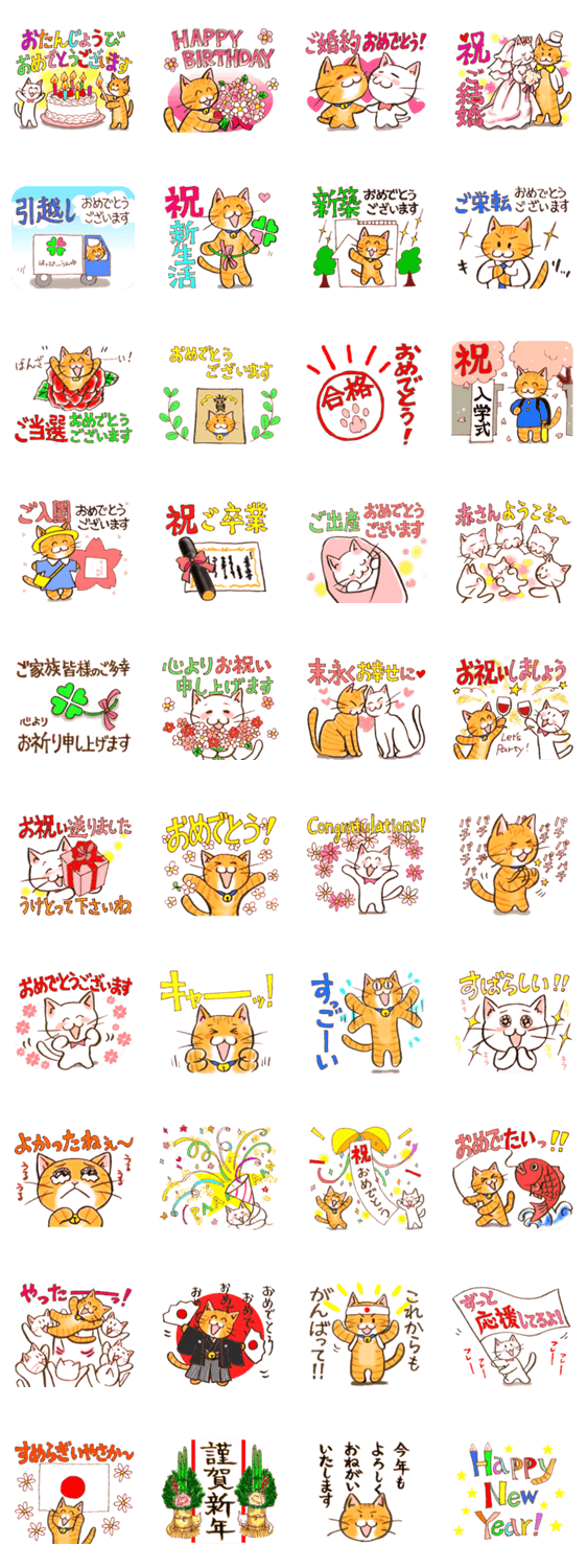 | スタンプ説明 | おめでたい場面をお祝いの言葉で彩ってくれる猫スタンプです。 一年中使えます♪ |