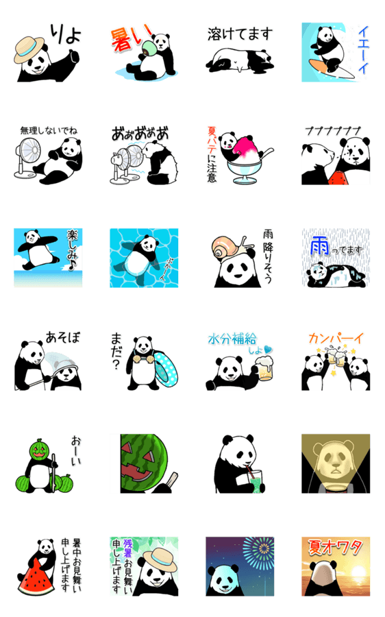 | スタンプ説明 | やる気のないパンダシリーズの夏編、動くスタンプです。日常会話に使えるものばかり集めました。動かないバージョンもあります。 |