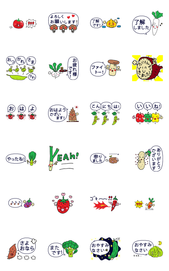 大人の日常に毎日使える文字大きめの手書きスタンプです。野菜がふきだしでお話☆動きがあり楽しく使えます♪アニメーション、デカ文字、敬語、毎日、日常、吹き出し編☆